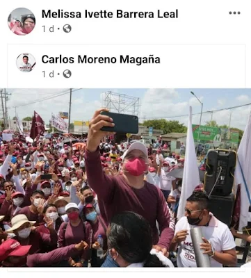 La esposa de Manuel Jesús Moreno, Supervisor Electoral del INE, Melisaa Ivette Barrera Leal es una de las principales operadoras de Moreno Magaña en Kanasín, y juntos reparten despensas, juguetes para niños y otros productos en las mencionadas colonias y fraccionamientos a favor del candidato morenista Carlos Moreno.